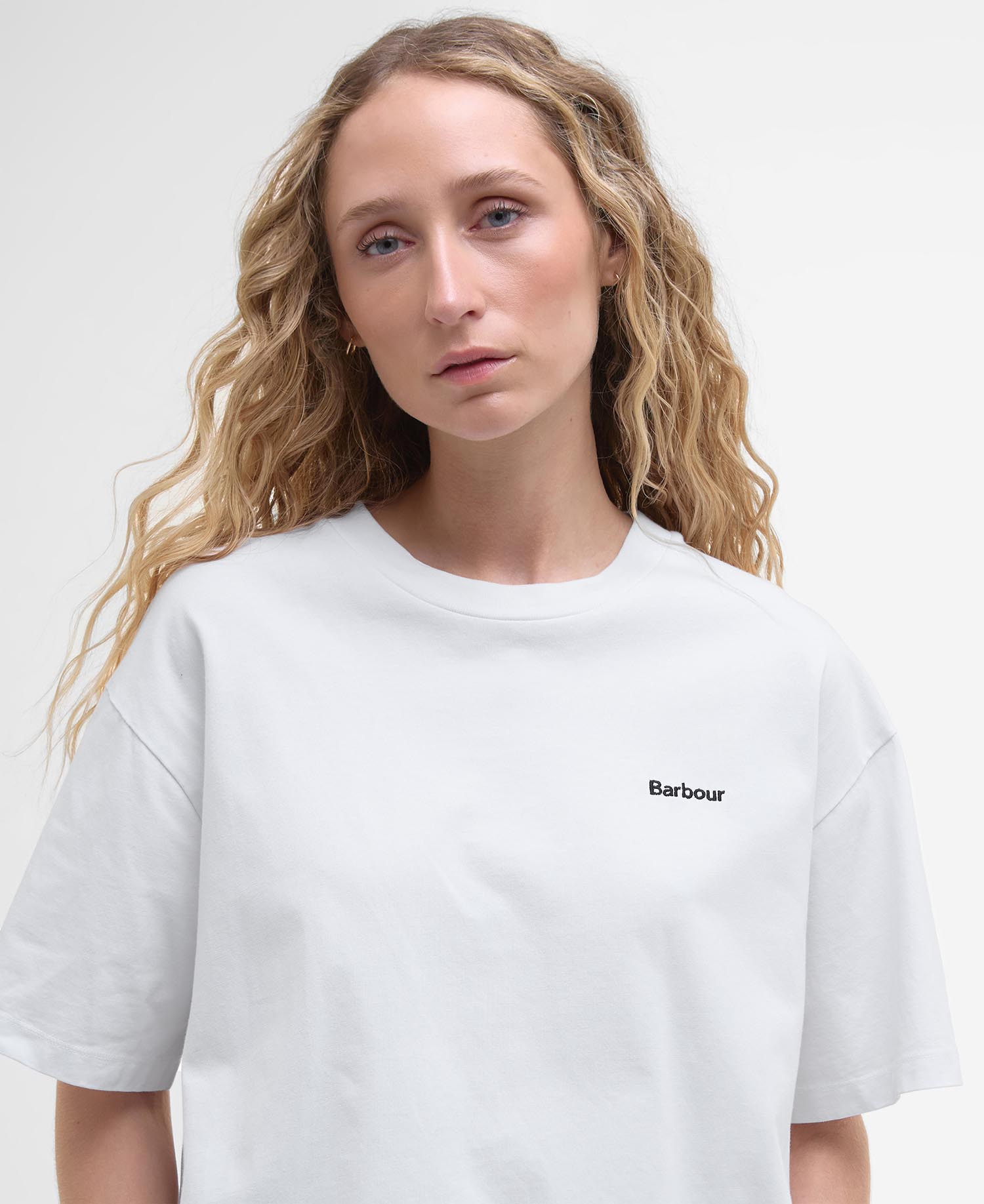 This Barbour Jema T-Shirt is a relaxed-fit style that features a ribbed neckline for a comfortable and casual look. The contrast Barbour block embroidery on the left chest pocket adds a touch of classic Barbour branding, while the oversized fit gives it a relaxed everyday feel.