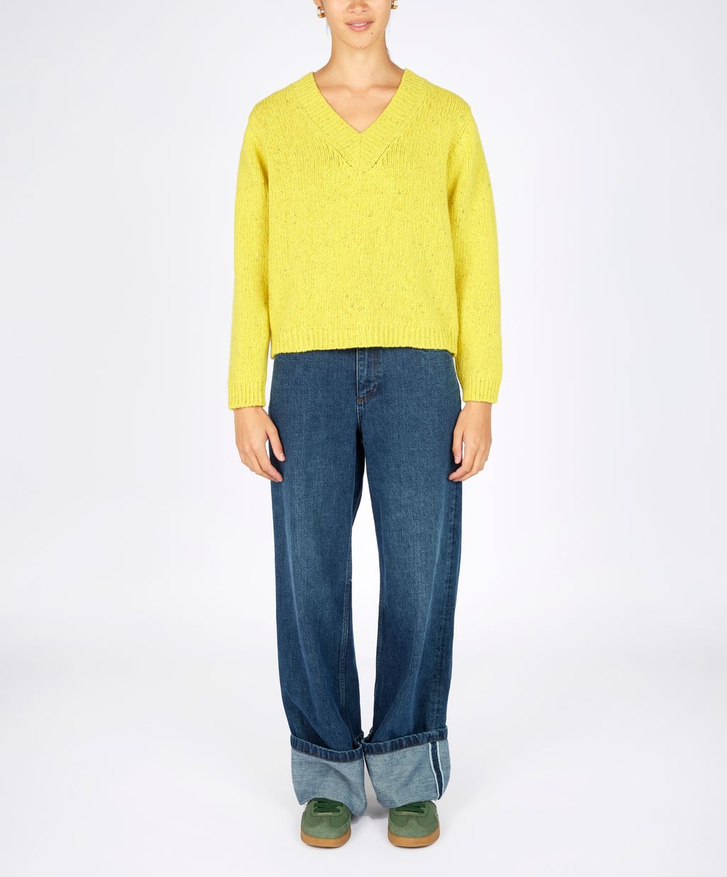 As part of the Genesis collection, the 'Kayla' V-Neck features a slightly cropped design with a contemporary boxy fit. Buttercup is a vibrant bright yellow with flecks of Ink, orange and natural highlights. This versatile piece is designed to be worn alone or layered over a shirt, making it a perfect addition to your wardrobe. Made from a blend of 95% wool, 5% cashmere for an even softer, more luxurious hand feel.