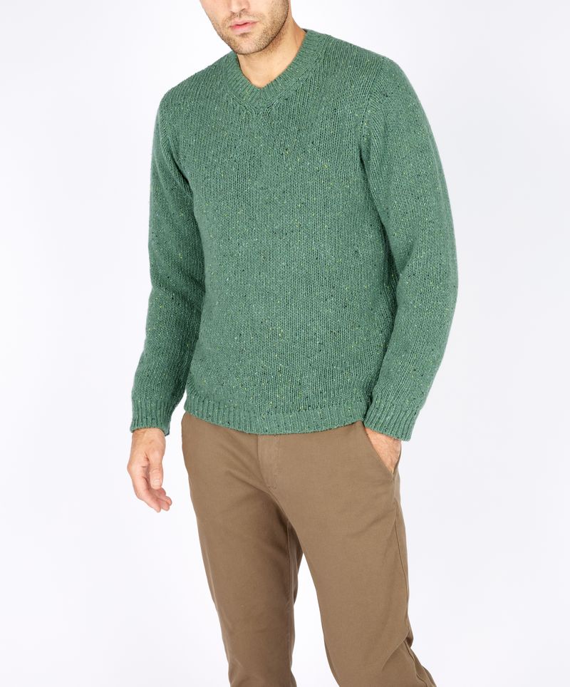 As part of our Heirlooms Collection, this chunky, jersey V-Neck sweater with the added softness of cashmere, our Kilbride V-Neck is a timeless classic. Wave is a deep duckegg green with black, lime, and spruce green neps.