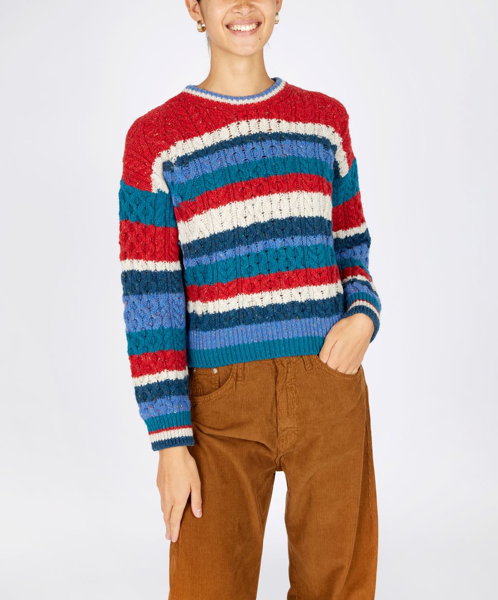 As part of the Genesis collection, the 'Maya' multi-coloured sweater fuses traditional Aran stitches with a playful, contemporary silhouette and multi coloured stripes. A vibrant chilli base with stripes of chalkstone, teal, marina and deep ink marl. This style is a relaxed fit and is designed to be cropped yet generous. Made from a blend of 95% wool, 5% cashmere for an even softer, more luxurious hand feel.