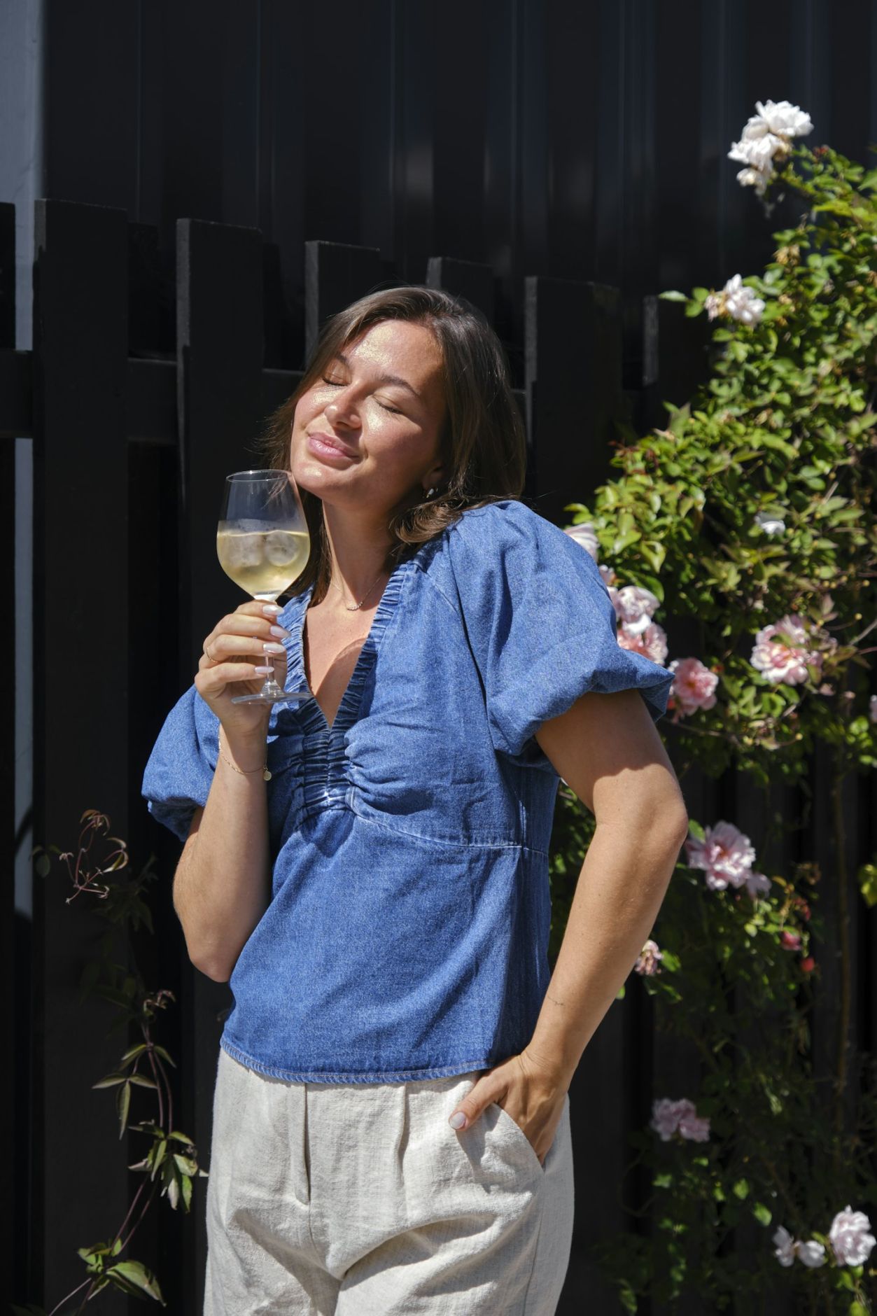 V-neck blouse with a denim look, slightly puffed sleeves and hidden zipper.