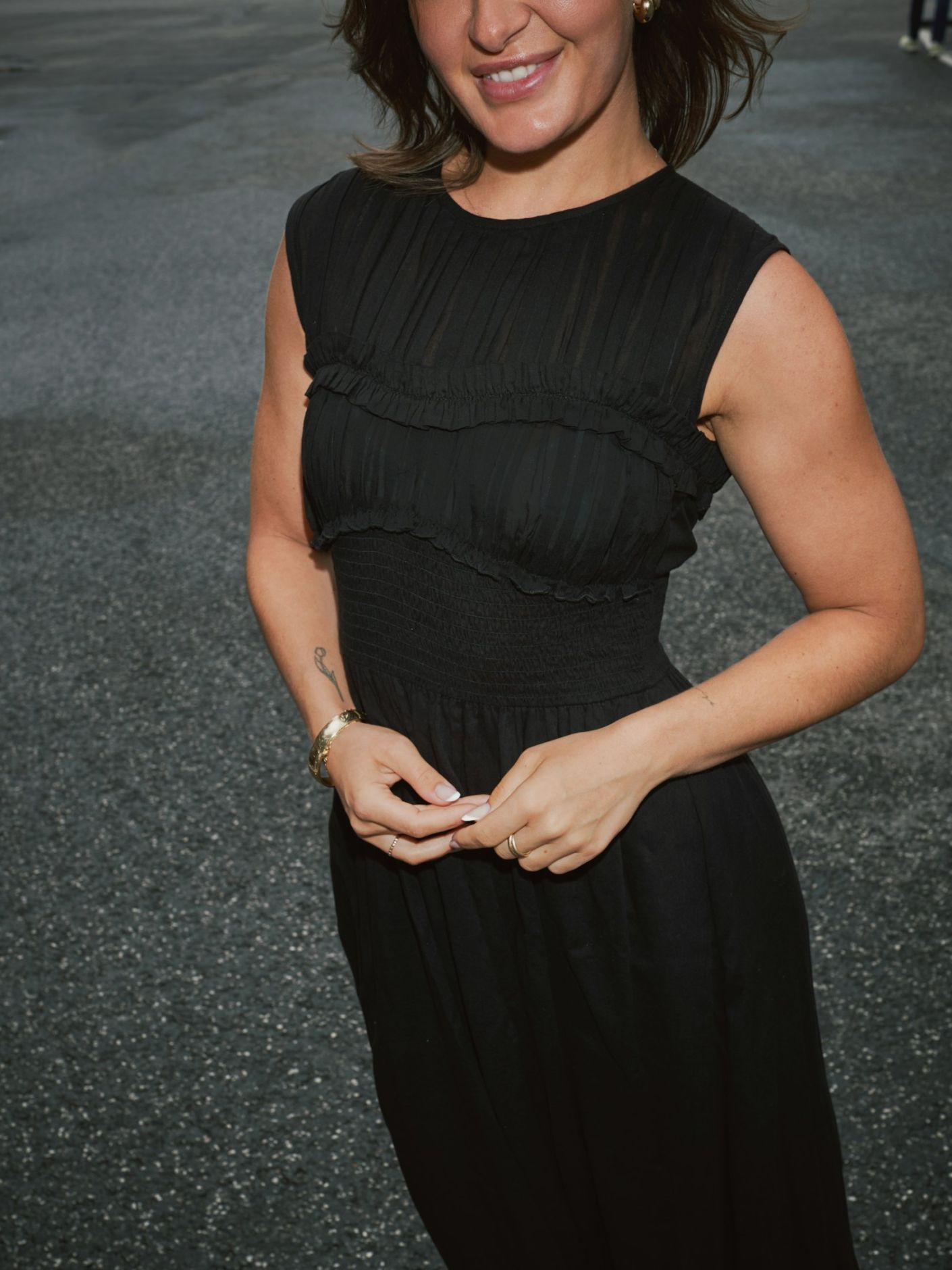Round neck sleeveless maxi dress with smocking, frill details and button closure on neck.