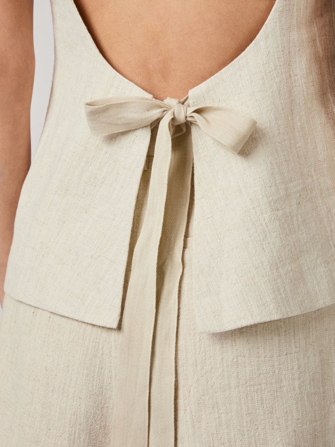 Cool top in ramie quality. The top has an open back, fastens at the neck, and ties at the bottom in the back.